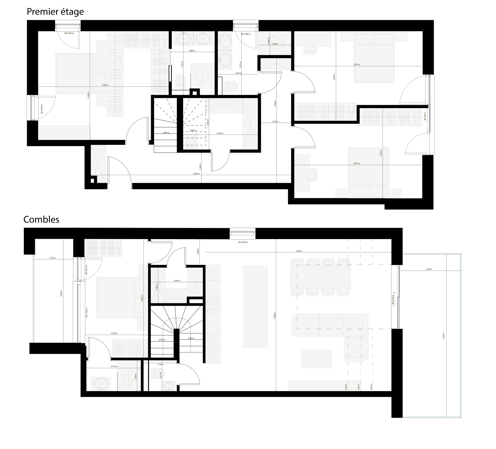 1er étage : débarras/buanderie – 3 chambres – 2 salles de douche avec WC